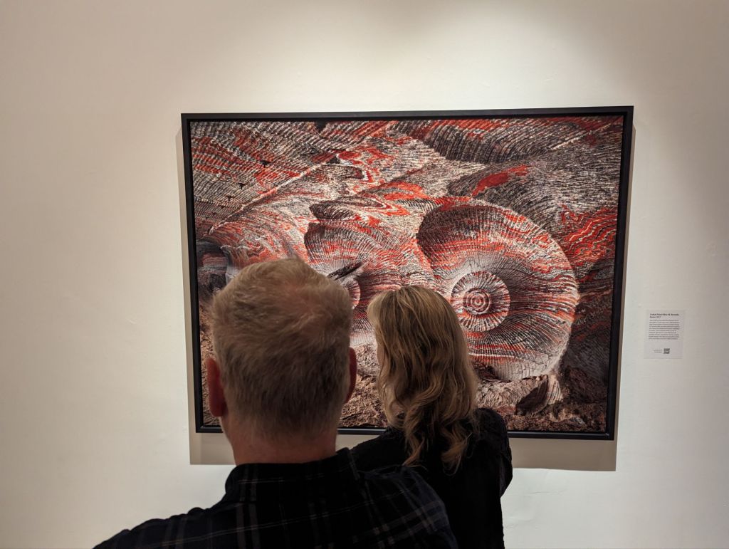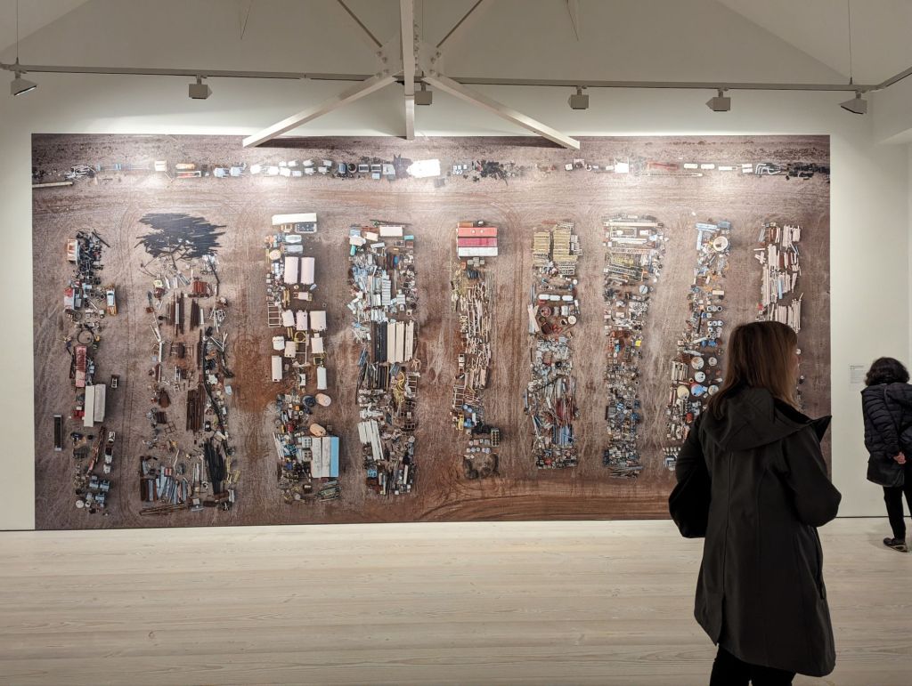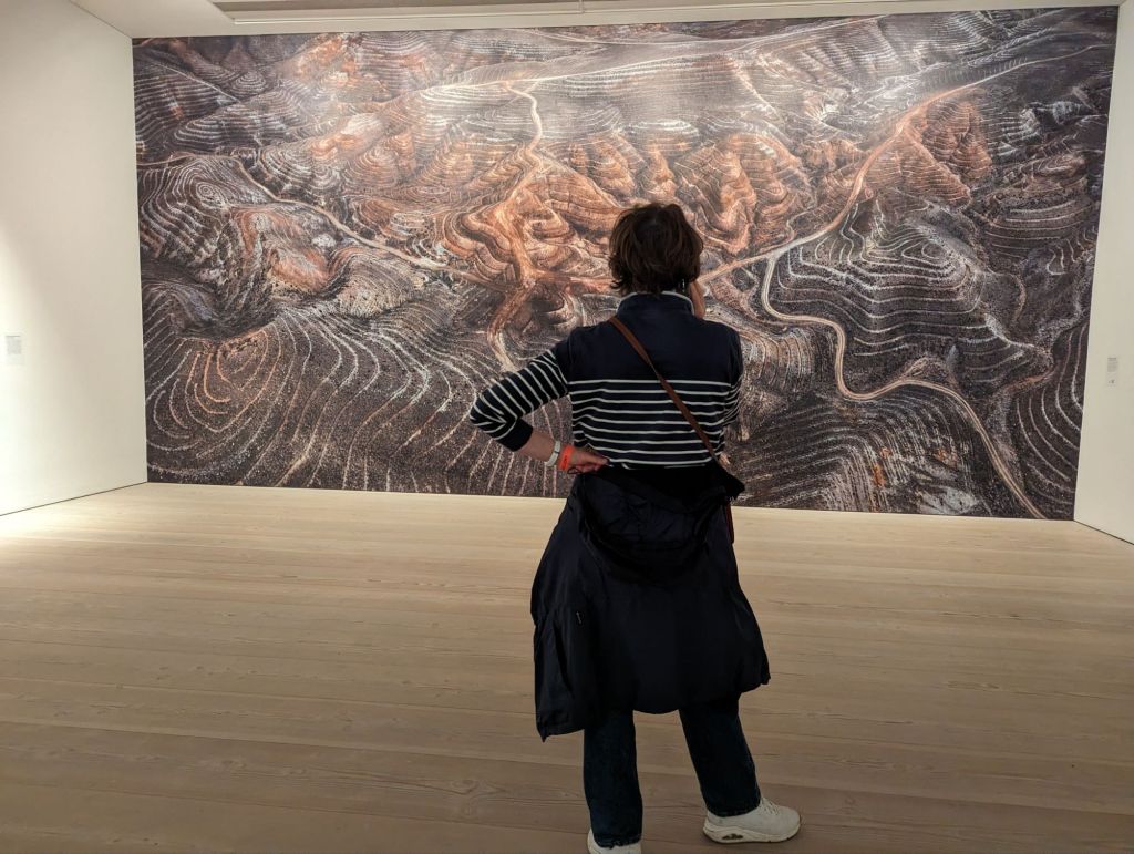 The exhibition (was on at the Saatchi Gallery till May 6th 2024) showed Nature, mostly transformed through Industry; a predominant theme in his work. Farming, foresting, quarrying s tone, oil, transportation, silicon, and so on are shown from a great height. They are often difficult to recognise as man’s damage to the landscape. The gigantic aerial photographs of subjects are rich in detail and scale yet open in their meaning. They appear to be almost abstract and force you to get up close to them to spot a machine digger or person for a sense of their immense scale.